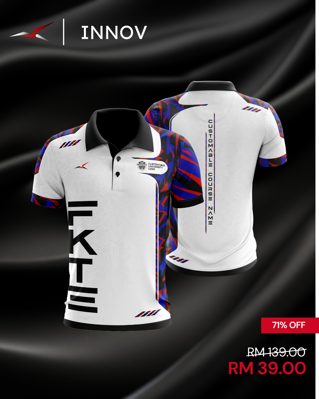 Blending modern aesthetics with functional identity. It features a clean, structured look with a white base, contrasted by bold geometric patterns on the sleeves and sides, adding a dynamic and energetic feel. The large customizable FKTE text on the front and customizable course name on the back emphasize personalization and affiliation, making it ideal for institutions, teams, or events.