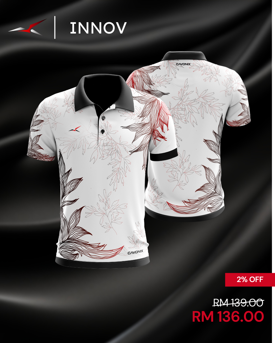 Featuring a white base with elegant floral line art in black and red, creating a sophisticated yet artistic look. The black collar and sleeve accents add contrast, enhancing its modern and refined aesthetic. Perfect for those who appreciate minimalism with a touch of nature-inspired elegance.