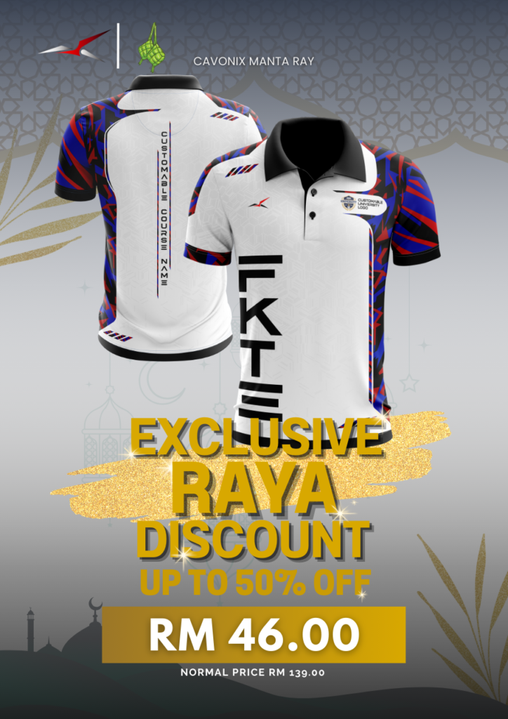 Blending modern aesthetics with functional identity. It features a clean, structured look with a white base, contrasted by bold geometric patterns on the sleeves and sides, adding a dynamic and energetic feel. The large customizable FKTE text on the front and customizable course name on the back emphasize personalization and affiliation, making it ideal for institutions, teams, or events.